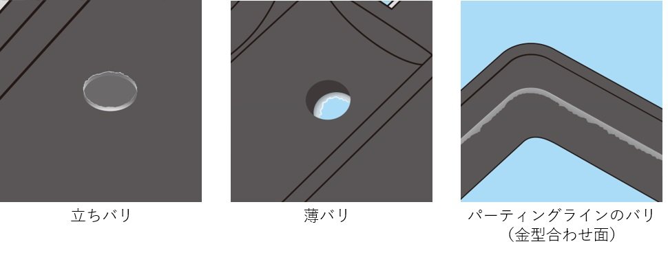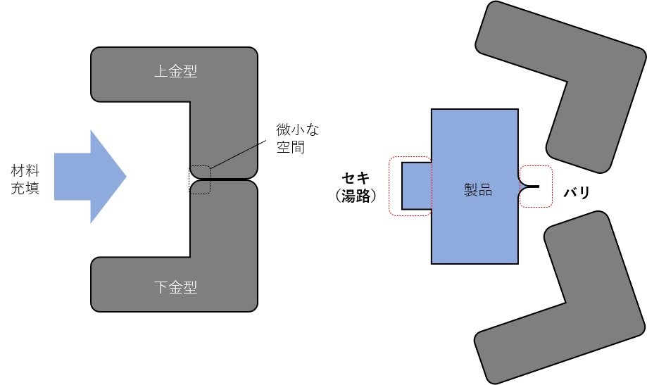 In the case of casting or injection molding, where a liquid material is poured into a mold and hardened, the image shown in the above figure is used. Molding is divided into two, three, etc., so that the hardened product can be removed from the mold. There is a minute space on the mating surface (parting line) of the divided mold, and burrs are generated when the space is filled with material. In addition, the material of the hot water passage connected to the mold hardens and sticks to the product. This is called a seki or runner and is an unnecessary part similar to a burr.