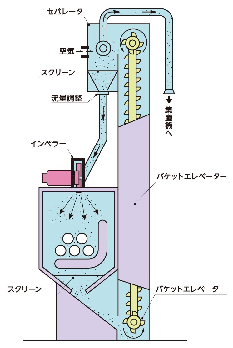 จากภาพประกอบ ใบพัดตี หรือ Impeller ที่ถูกขับเคลื่อนด้วยระบบมอเตอร์ความเร็วสูงยิงทรายที่ถูกป้อนเม็ดยิงทรายด้วยกระพ้อที่ถูกตักมาจากด้านล่าง ซึ่งเม็ดยิงทรายเหล่านั้นจะระบบกรองแยกฝุ่นกับเศษชิ้นงานที่ถูกยิงออกไป ก่อนที่จะนำเม็ดที่ยังใช้งานได้เข้ามาวนใช้ในระบบอีกครั้ง ดังภาพด้านล่าง